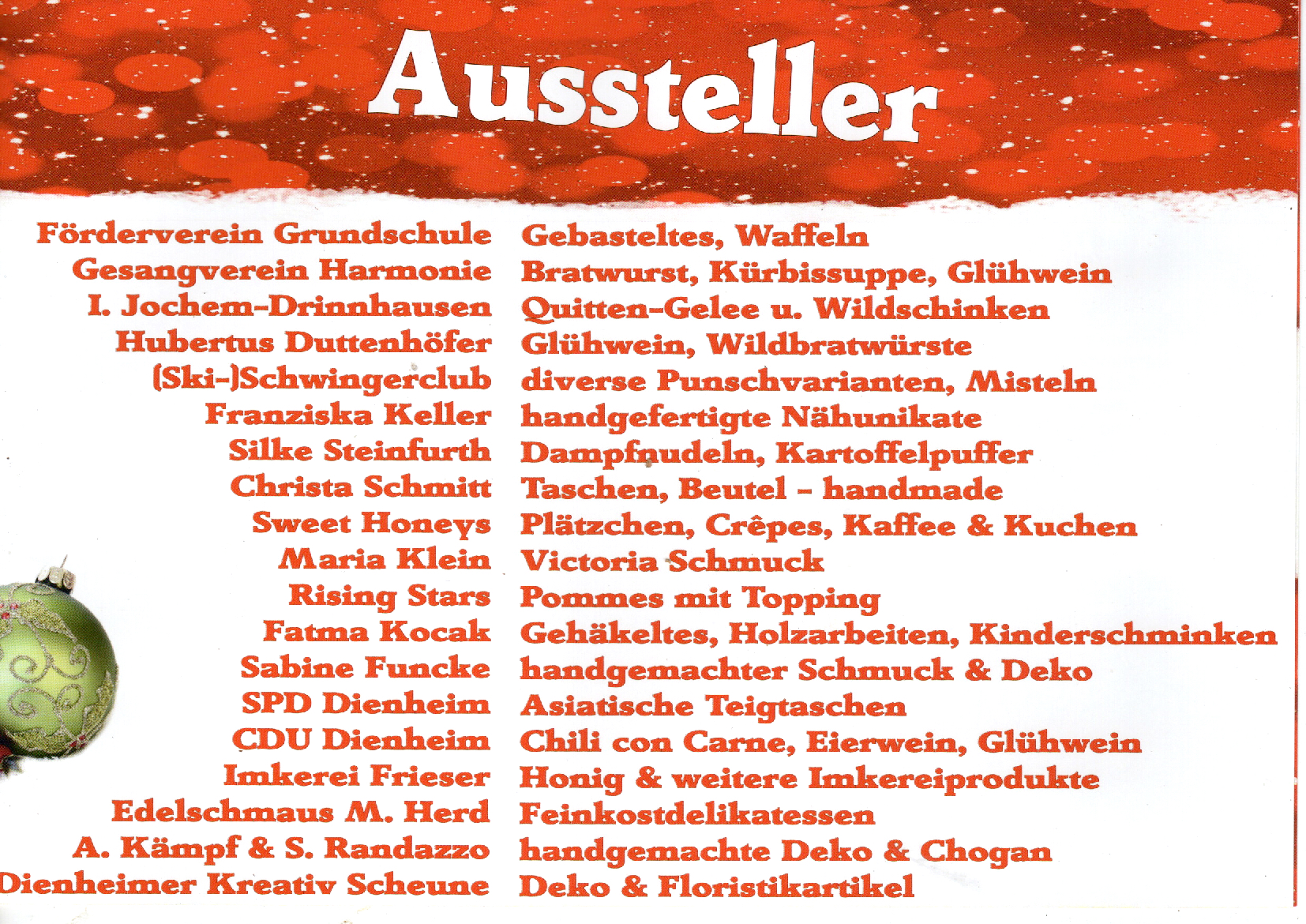 Auch in diesem Jahr nehmen wir am Weihnachtsmarkt teil. Mit Glühwein und der Spezialität Eierwein sowie mit unserem Hauptgericht-Chili con carne- wollen wir unsere Gäste bewirten Wir freuen uns über einen zahlreichen Besuch.
