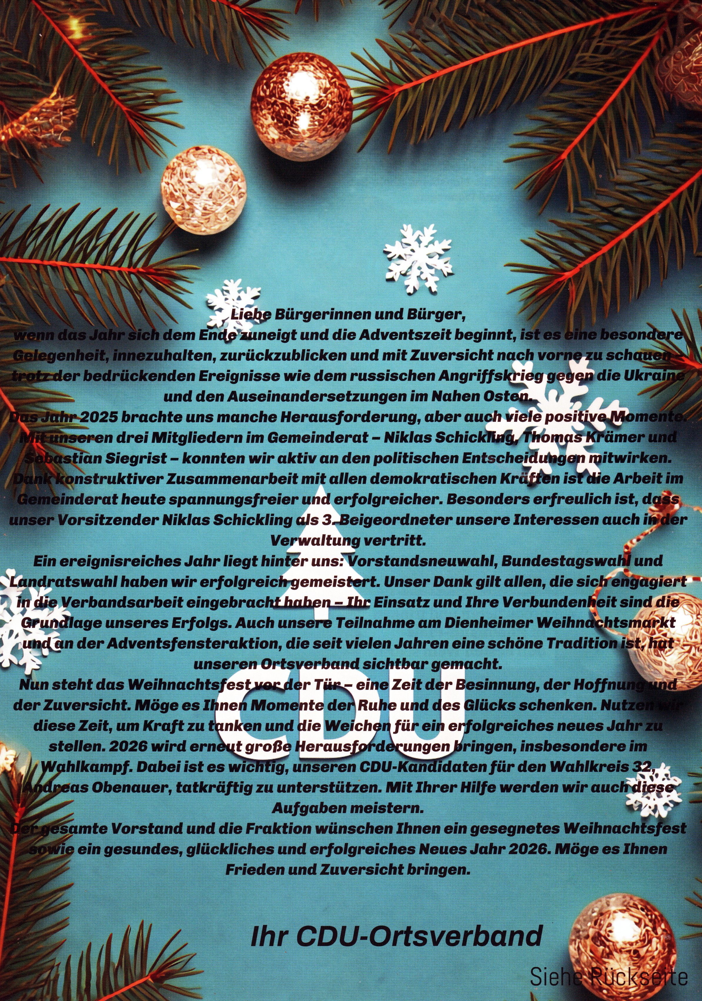 Der Dienheimer CDU-Ortsverband schickt Weihnachts-und Neujahrsgrüße.